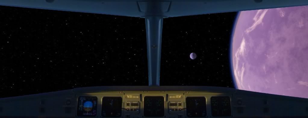 I can imagine your planetary shuttles will have 3D cockpits anyway, mine's just a mere 2D idea, created for a single 22" widescreen monitor at 1920x1080. The picture sizes and resolution would not be suitable for larger multi-monitor set-ups, although the wider picture of the two above can be split in two for a dual monitor set-up, but resolution-wise it may not look so good.