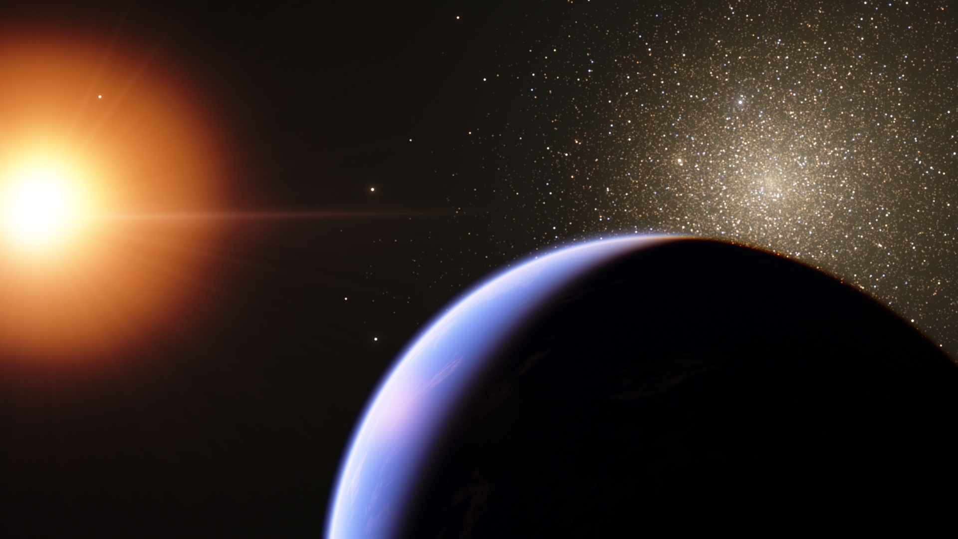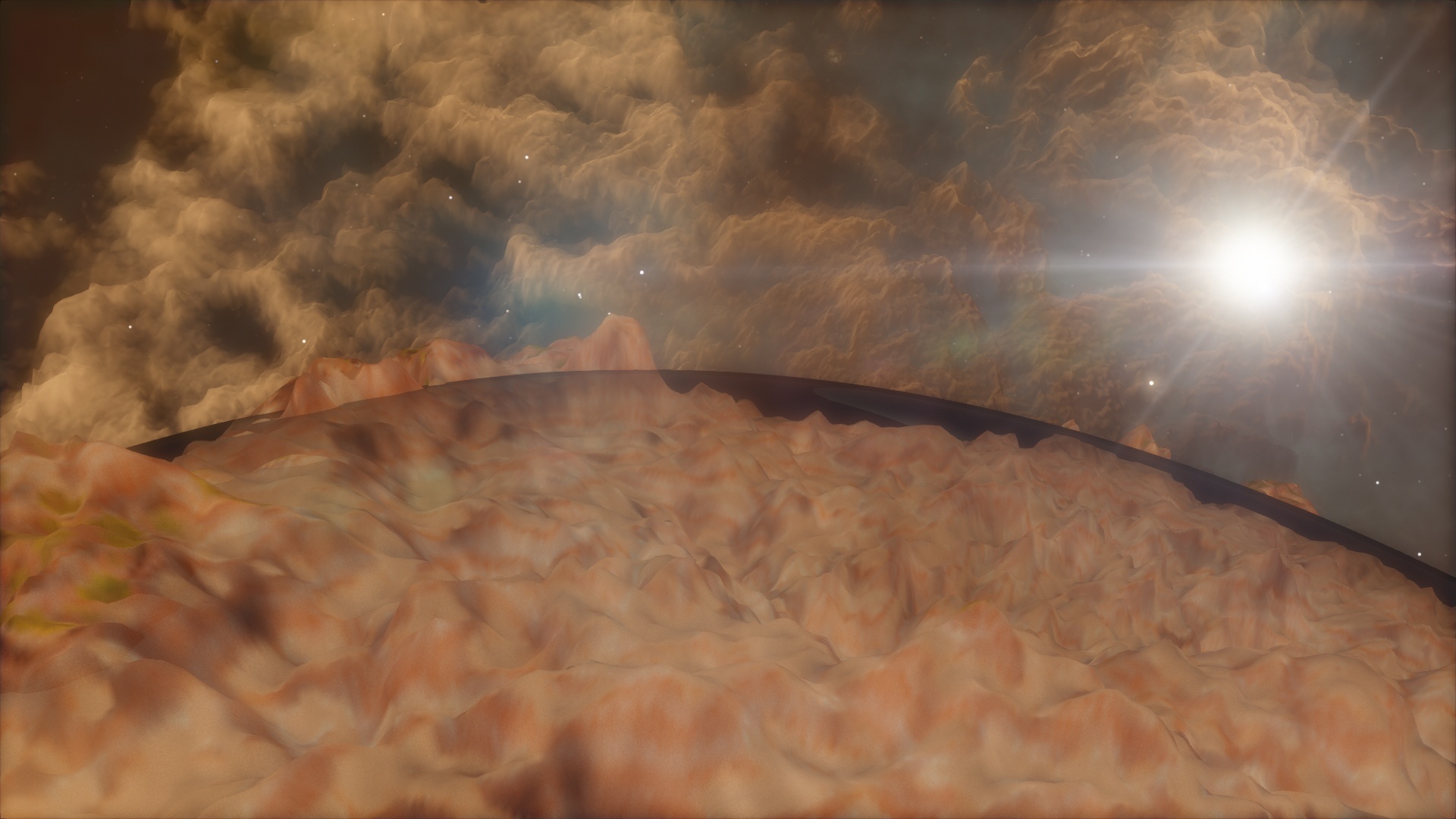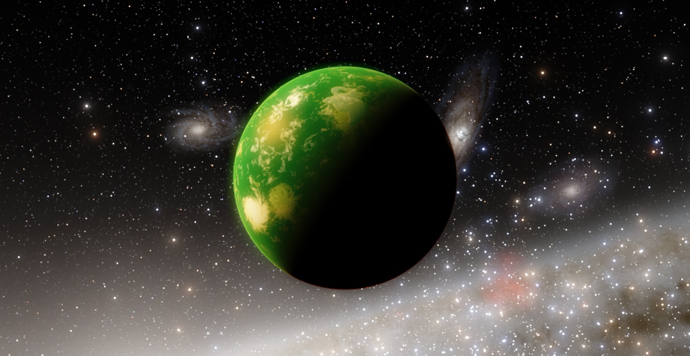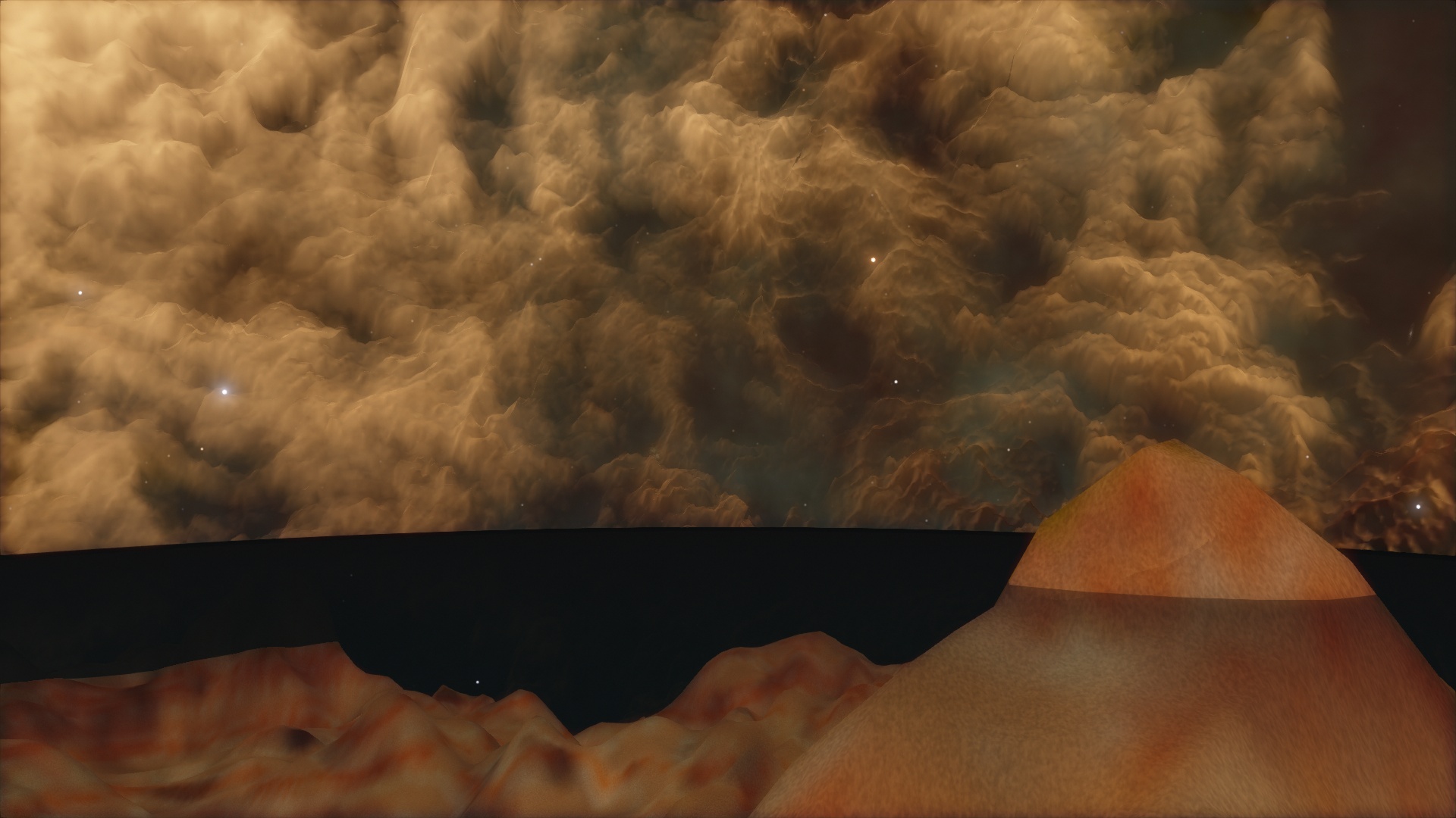 This is a picture of an earth-like planet, orbiting a star on the edge of a galaxy that itself is on the edge of the procedurally generated universe. One half of the planet's sky is filled with stars while the other half is completely void of them.
