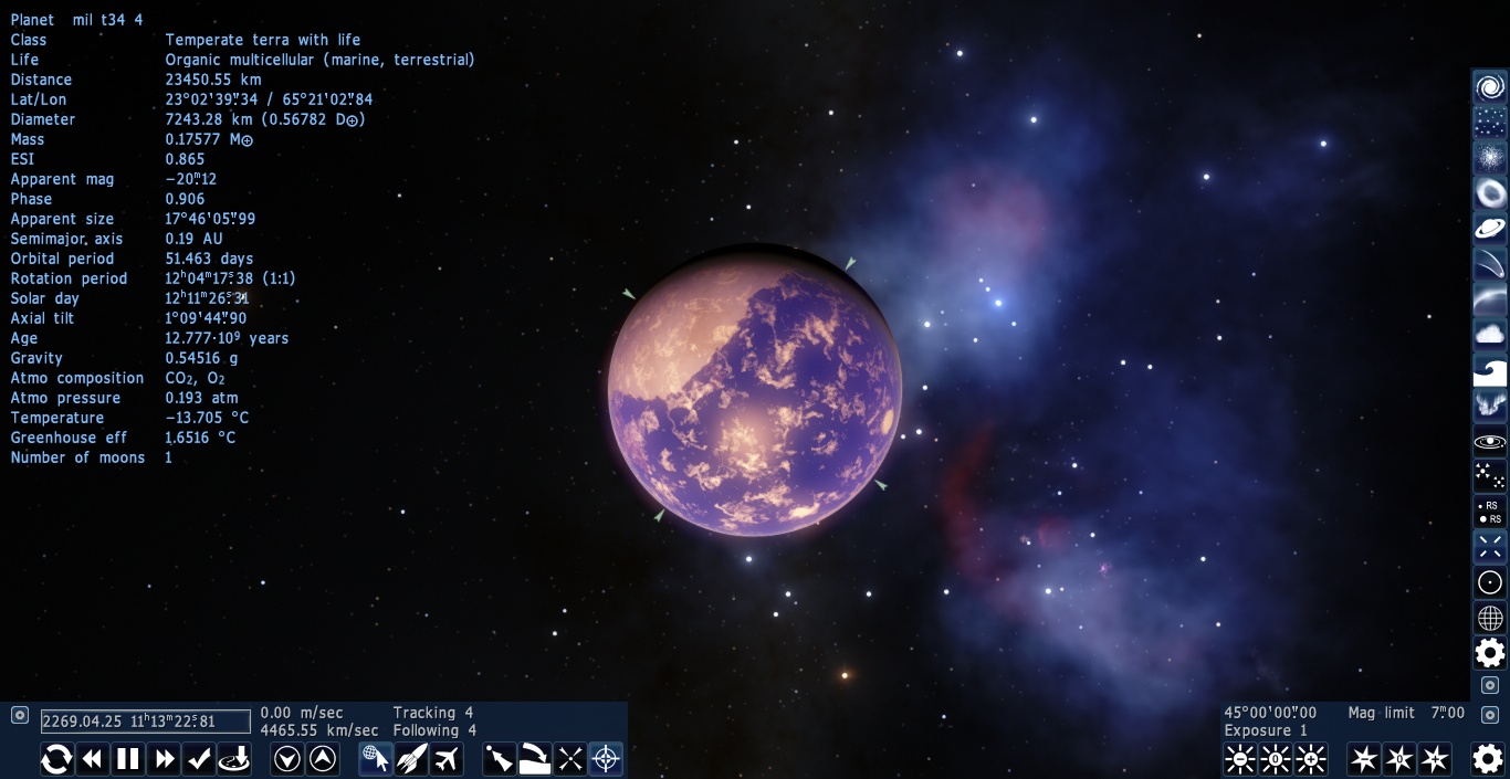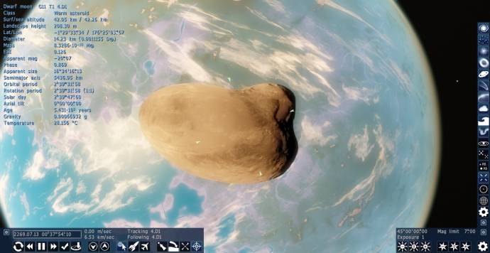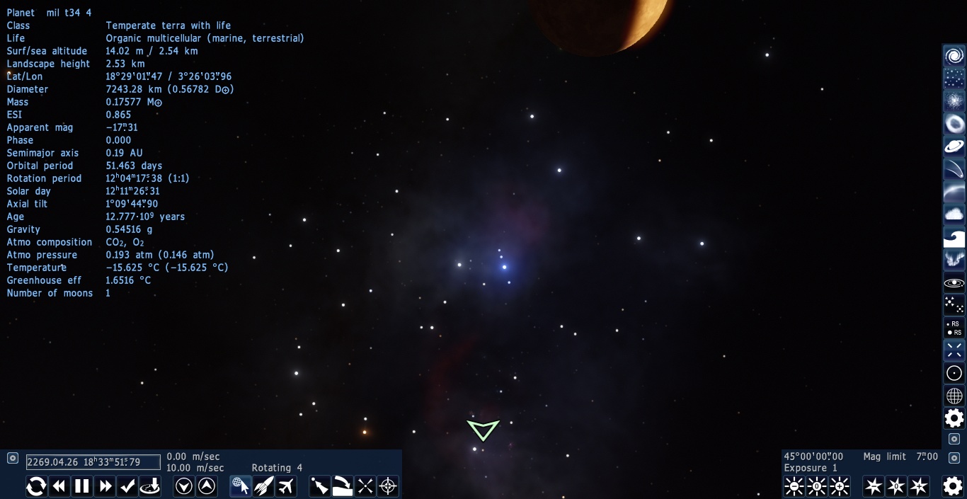 I thought at first I had found something like the Ceres white spots on one of these twin desert worlds, but on closer inspection it turned out to be something a little more common. It's still cool to see an asteroid orbiting between two worlds like this. Wonder if it is in a Lagrange point. (I did not speed up time to find out.) RS 0-2-35-1317-2706-7-38031-4902 2