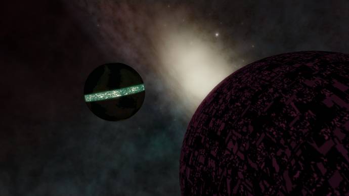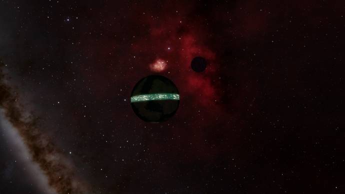 | This is not a 'spaceship'. This is a normal Terra planet with a ring around the equator, and its moon. I have several versions of it, which I have placed at different locations. The ring is constructed similar to 'Andwari's Ring'