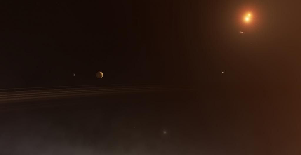 I like how the seas on the planet are actually very dark red; almost black, even! Must be some interesting organic chemistry going on there. Maybe I just don't visit Titans often enough, but this is the first one like this that I've seen.