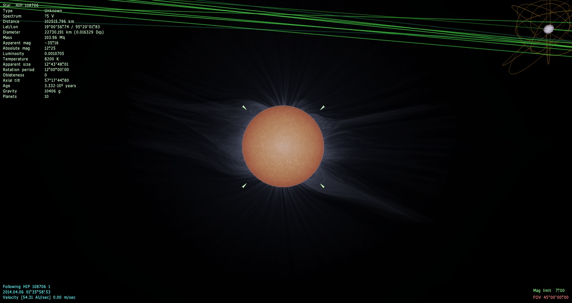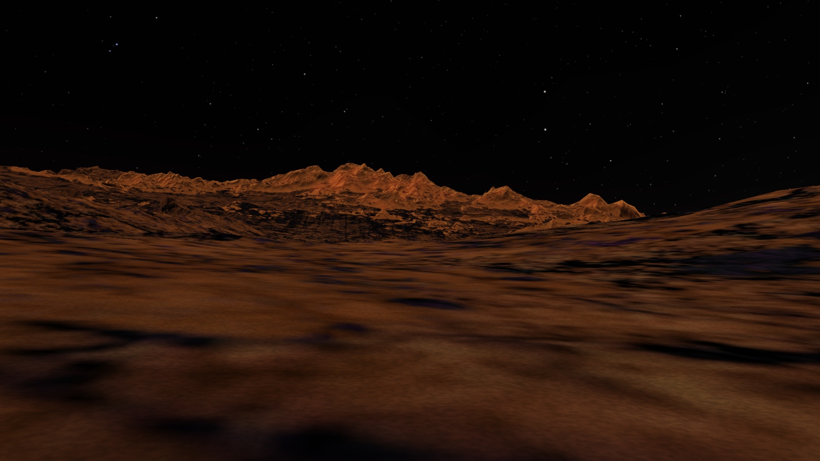 | Judging by the colour of the rock and the moon, the parent star is a red or orange dwarf. These emit most of their light in the infra-red, and it is expected that any plant life able to photosynthesise with such light would most probably be black.