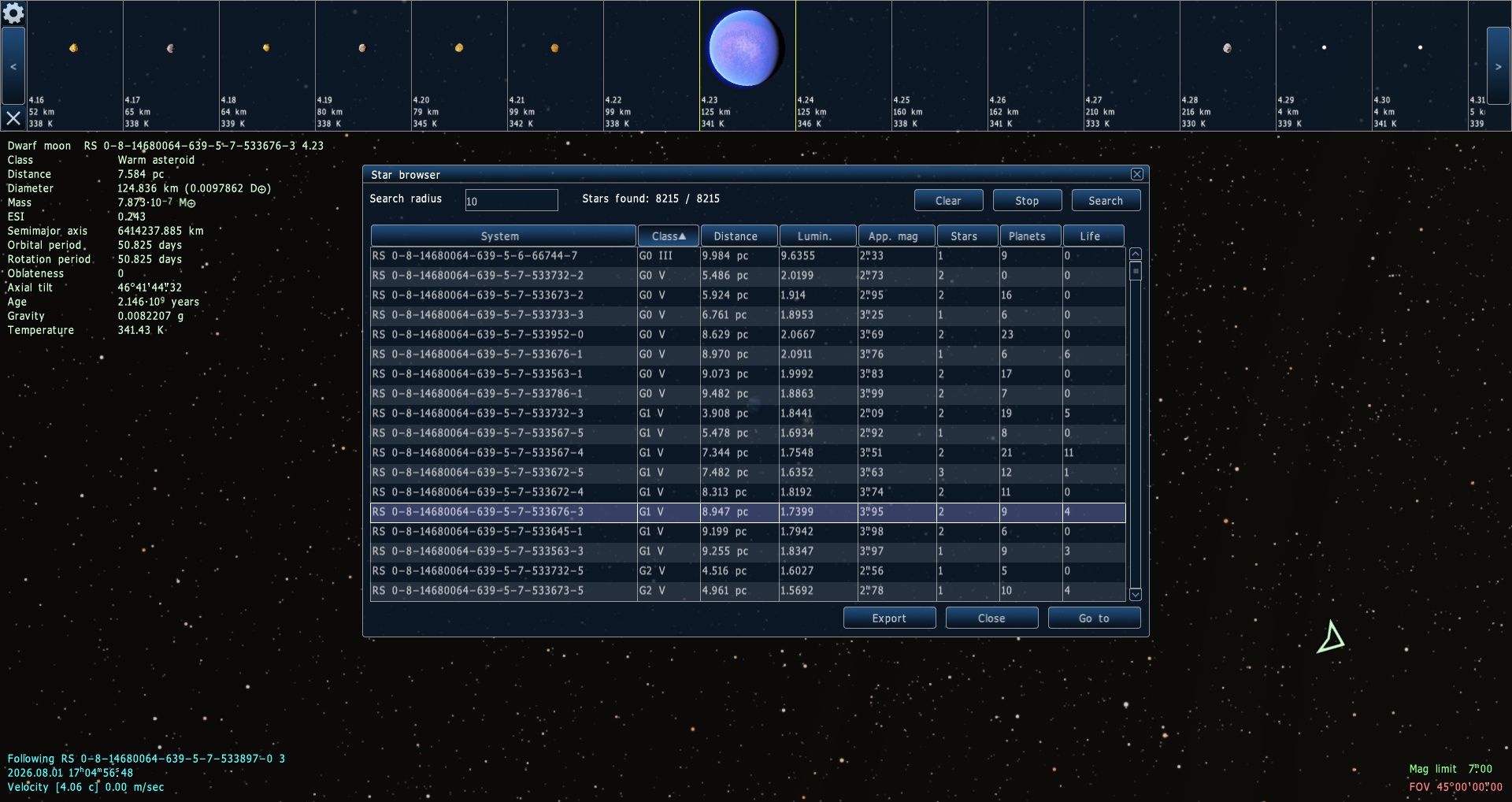 Real bugs: - Too many planets with life (panspermia issue) - Oceanias have landscapes above water - Several bugs with the planet editor - Changing "modes" between simulation and orbital when piloting ships can cause glitches - Few issues with asynchronous loading (stars don't always generate properly, especially when flying to new galaxies) - Holes in some giant stars when camera is directly above a very tall spot[example] - Flashing landscape LOD on a planet when Wiki for it is displayed - Star clusters not displayed in Wiki - GUI response issues with some users (interface items glitchy or not respond easily) - GUI toolbars may completely disappear when pressing pin button while half-hidden - Deep space objects (e.g. stars, galaxies) will shine through planets when HDR for DSO is off, but HDR is on and Bloom is on [example] - Some neutron stars can have very low temperatures[example] - Flickering flare color in close binary systems [example] - Auto-exposure does not react when a sun is blocked while diffraction spikes are set to normal or super - Planet rings have an unrealistic color palette - "Eclipse bug" on distant planets (weird dark shimmering on outer planet caused by inner planet crossing the sun or two suns eclipsing) - Cloud cyclones have cut edges sometimes - Level horizon command (End key) doesn't work properly on oblate objects - Problems when releasing Left + Right click - Lines or junctures are visible on planetary surface - Switching to fullscreen doesn't work sometimes - Weird behavior of movement keys in tracking mode (T) and after releasing it - Automatic reference object setting with spacecraft doesn't always choose the best object (for example, when near dwarf moons or debris asteroids close to a planet you are trying to orbit) - 3D water fog sometimes starts above the water surface - Problems with the skybox export interface, and with the planetarium after using it, for some users - Music player will unpause when SE window is minimized and restored, or when entering and exiting the main menu - If a galaxy model is selected, the camera is not following any object, and the program is in Edit Mode, closing and restarting the program will cause the WASDRF movement keys to behave incorrectly until the camera is set to follow an object - "Crop orbits" in the Map mode doesn't work - Spaceship and lens flare textures do not load when loader mode is set to "Immediate" - Visual atmosphere heights are inconsistently and unrealistically generated - Physical atmosphere properties are inconsistently and unrealistically generated, and are not tied to the visual models - Dwarf moons can be generated on colliding orbits - Moons are never generated with retrograde orbits - Bugs with the surfaces of carbon stars and zirconium stars - Cyclones are not generated in the southern hemispheres of gas giants - Sometimes, worlds which are too small are classed as "selena" when they should be classed as asteroid - Shimmering bloom splotch when very close to the surface of a planet [example] - CW/CCW rotation keys for ship in atmosphere are reversed - Mouse axis inversion settings for spaceship controls are not saved - Z faces are switched when exporting skyboxes (pos_Z is really neg_Z)