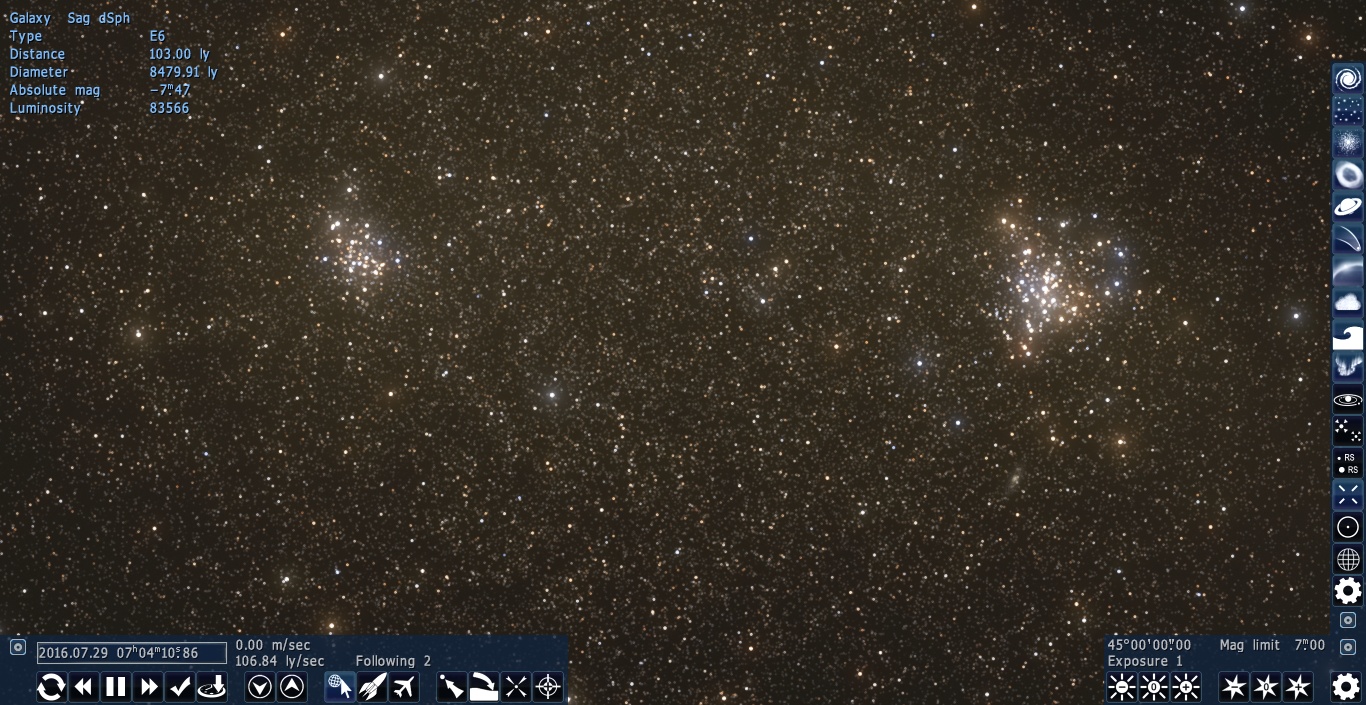 | Whoa--found a problem with RC2 I didn't expect to see at all. The Sag DEG galaxy and the SAG dSph galaxy are two different galaxies (only about 100 ly apart) in RC2, despite being the same galaxy in real life and in previous versions.