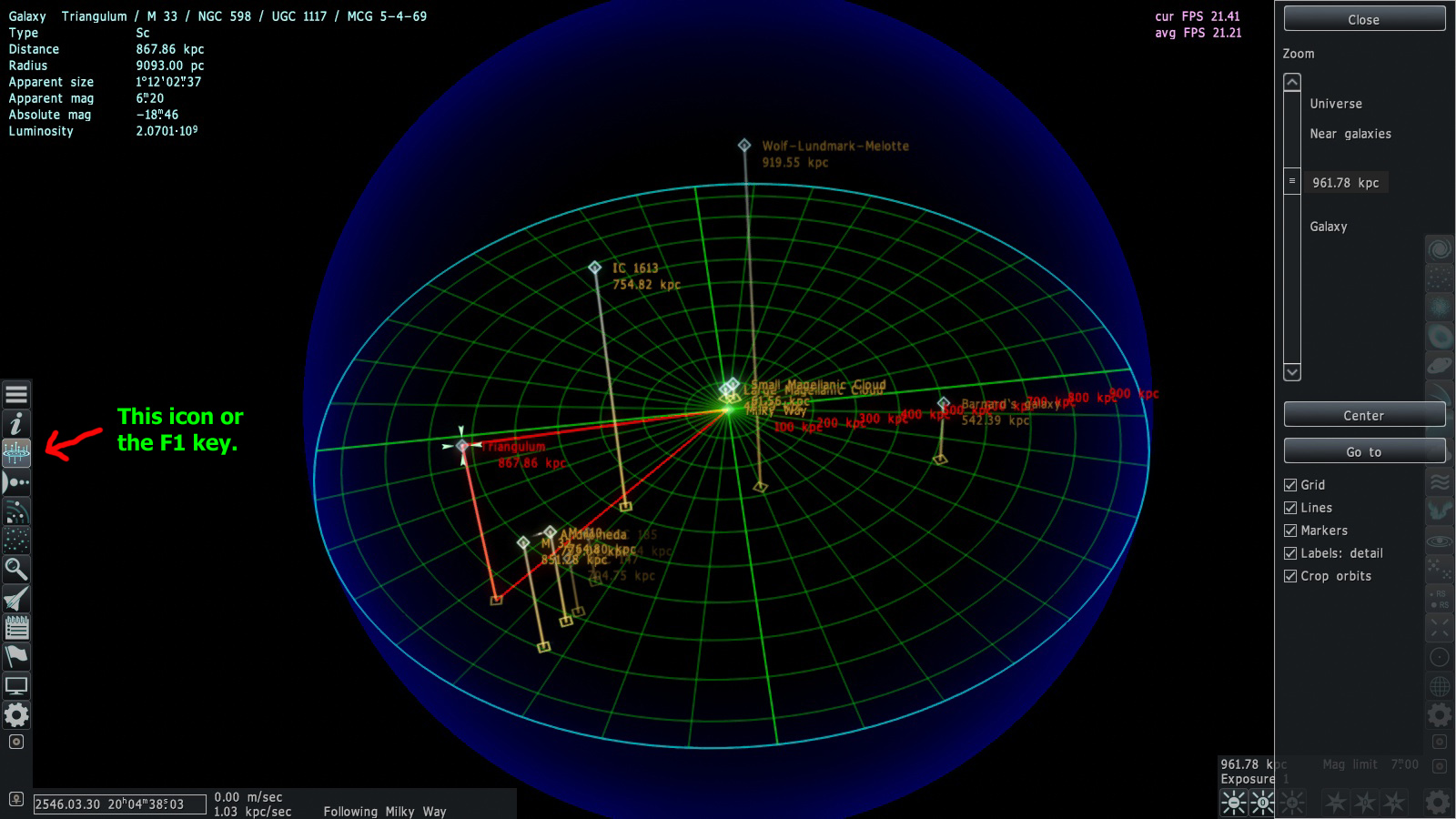 To find a galaxy, click the icon with the magnifying glass, or press F3, and enter the name of the galaxy in the opening window.