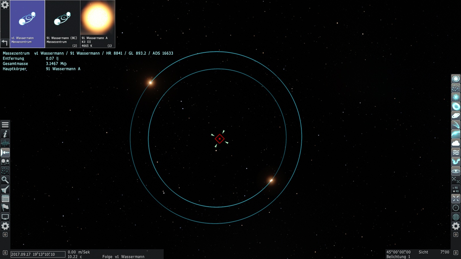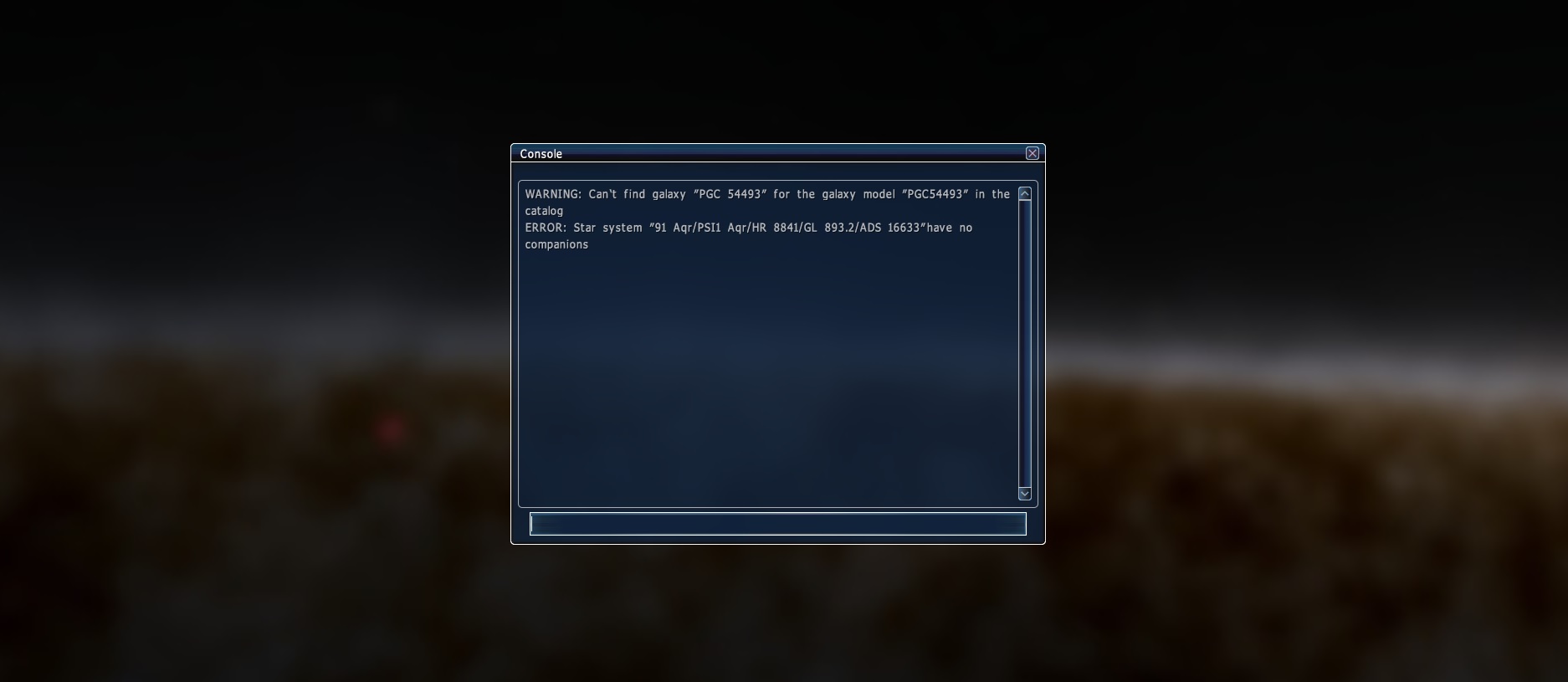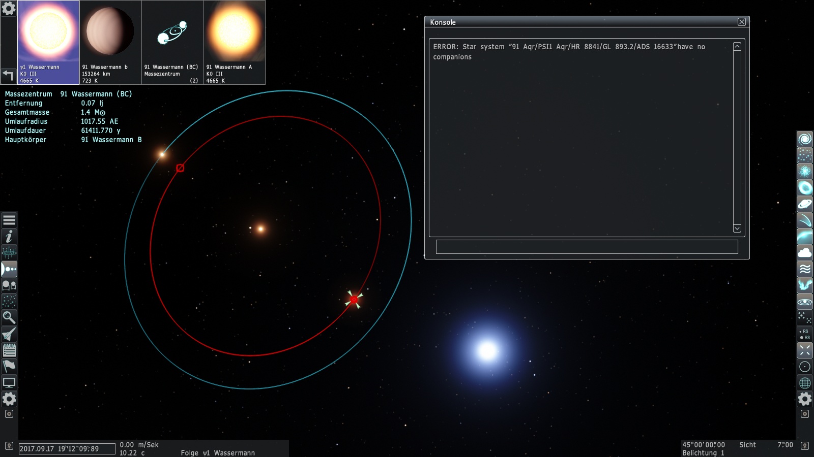 | Quote PlutonianEmpire (  ) Is anyone else having issues with 91 Aquarii? As soon as I ported over my catalogs from RC 2, it turned into a blue hyper giant with an AppMagn of -14.38 as seen from Earth, and the console shows an Error saying "Star system "91 Aqr/PSI1 Aqr/HR 8841/GL 893.2/ADS 16633" have no companions".