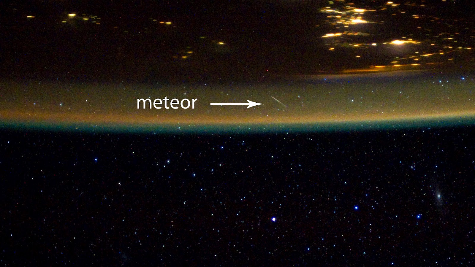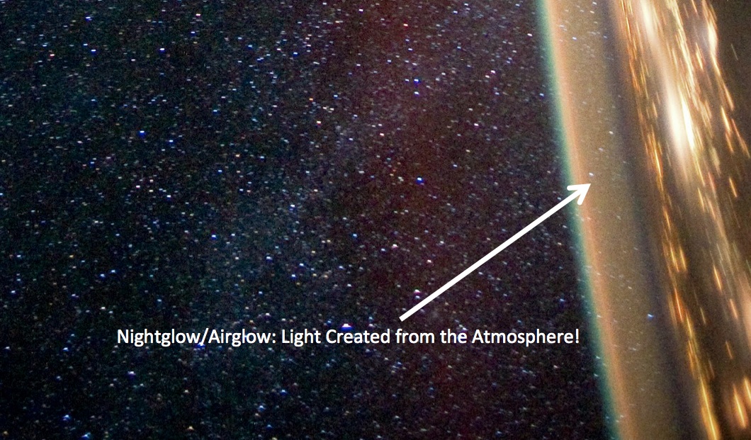 The upper parts of our atmosphere glow with a faint yellow, blue, green and red tint because of different light emission phenomena. The airglow color and intensity varies with composition and concentration of chemicals that also vary with height;